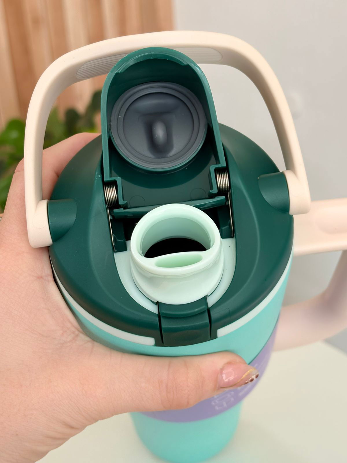 Vaso térmico estilo Quencher de 1.200 ml, ideal para mantenerte hidratada/o durante todo el día. Su sistema térmico ayuda a conservar las bebidas frías o calientes por varias horas, perfecto para agua, jugos, café o tlo que prefieras.